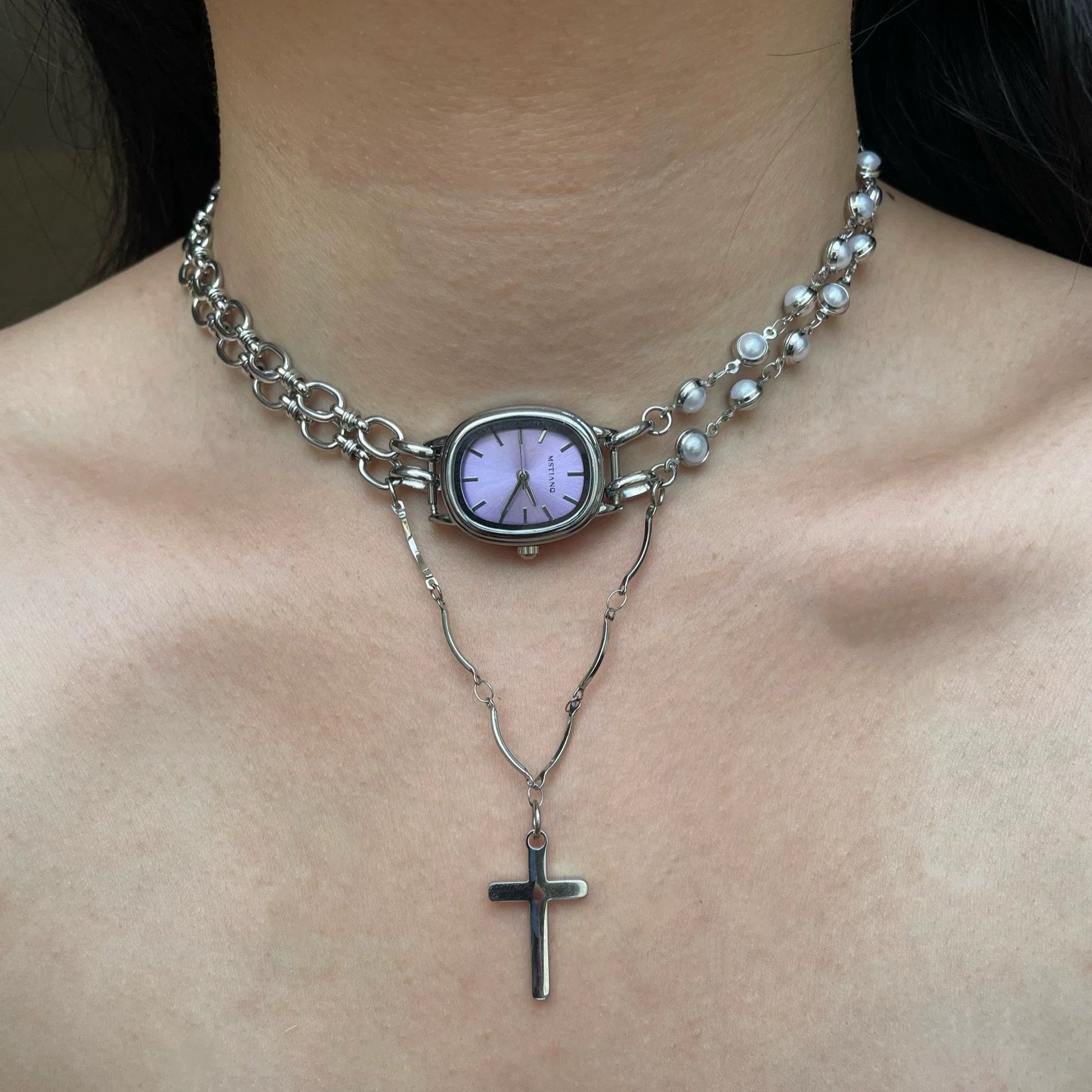 Vintage Retro Silver Chunky Chain Watch Choker Necklace, Purple Clock Green Clock Choker, Cross Layered Necklace, Y2K Jewelry, Handmade Gift