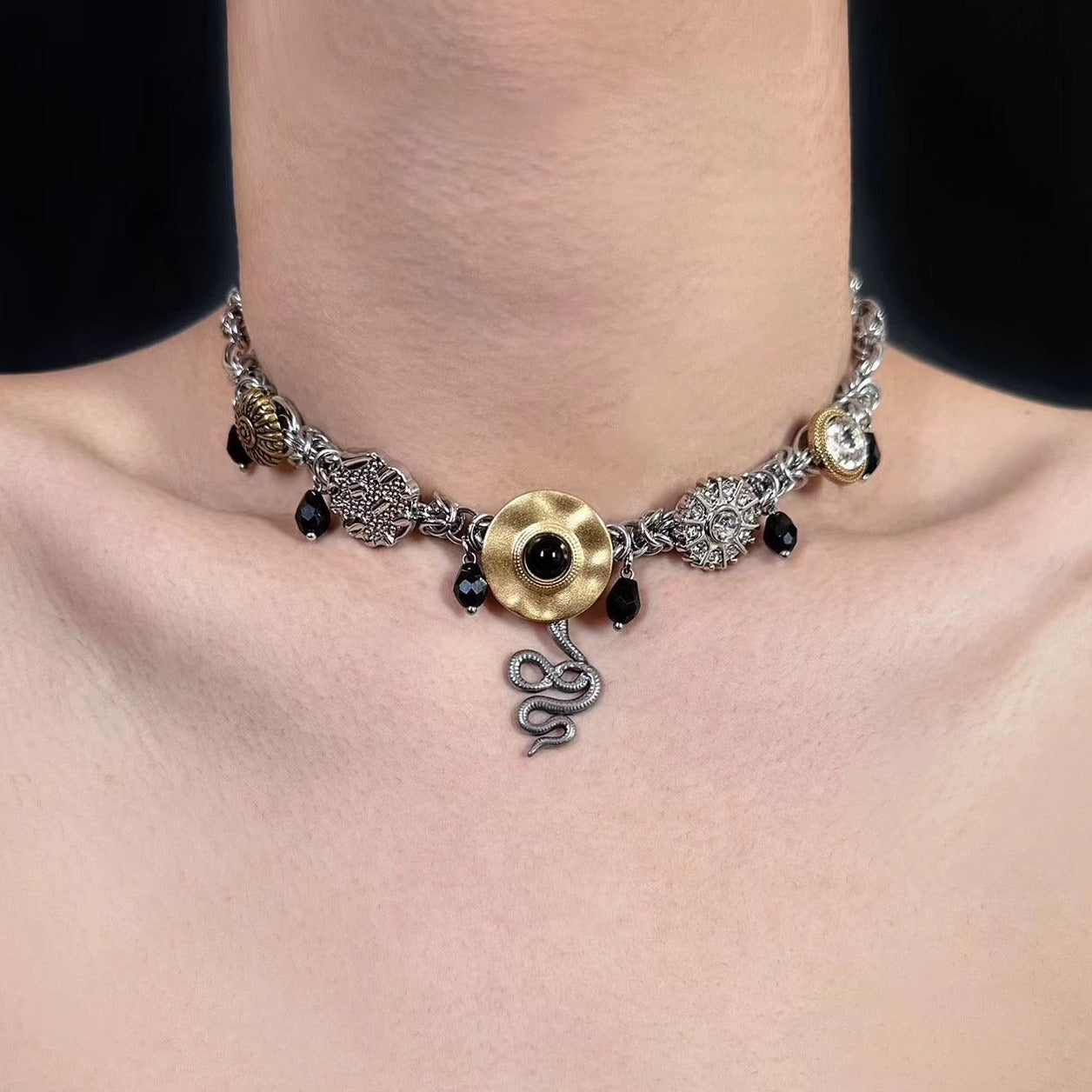 This unique, vintage-inspired and whimsical necklace combines elements such as a silver snake pendant, buttons, snail clasp, and diamond clasp, blending style with punk aesthetics—truly cool! A must-have for fashionistas.