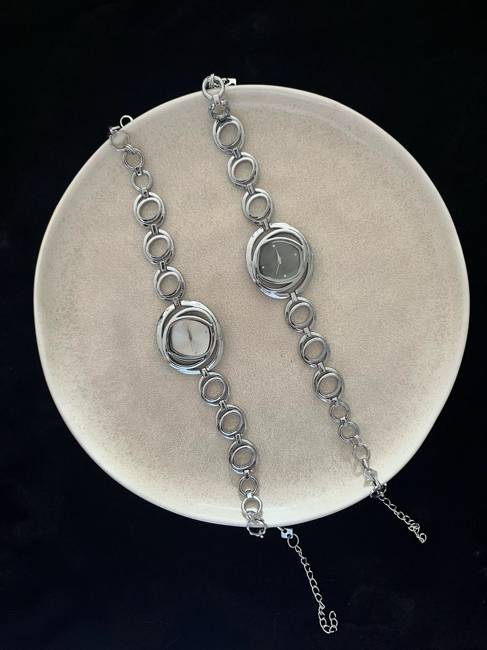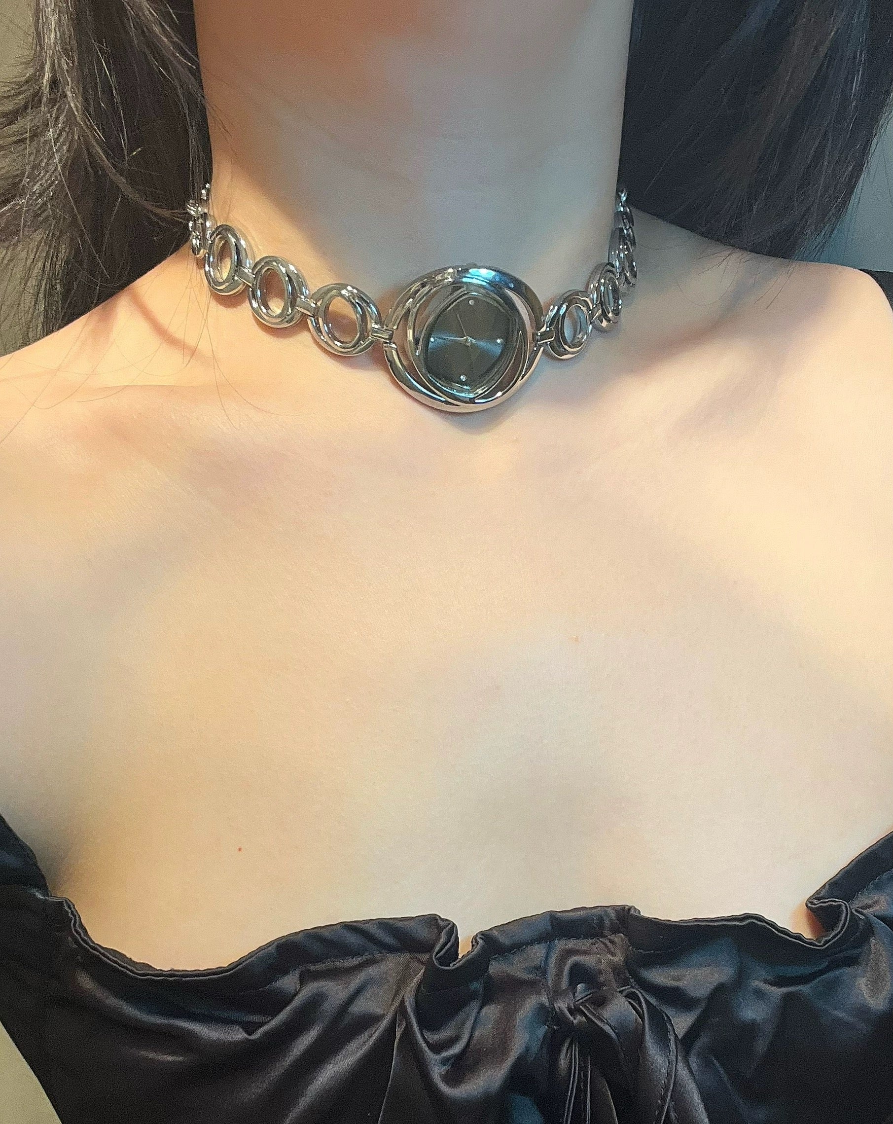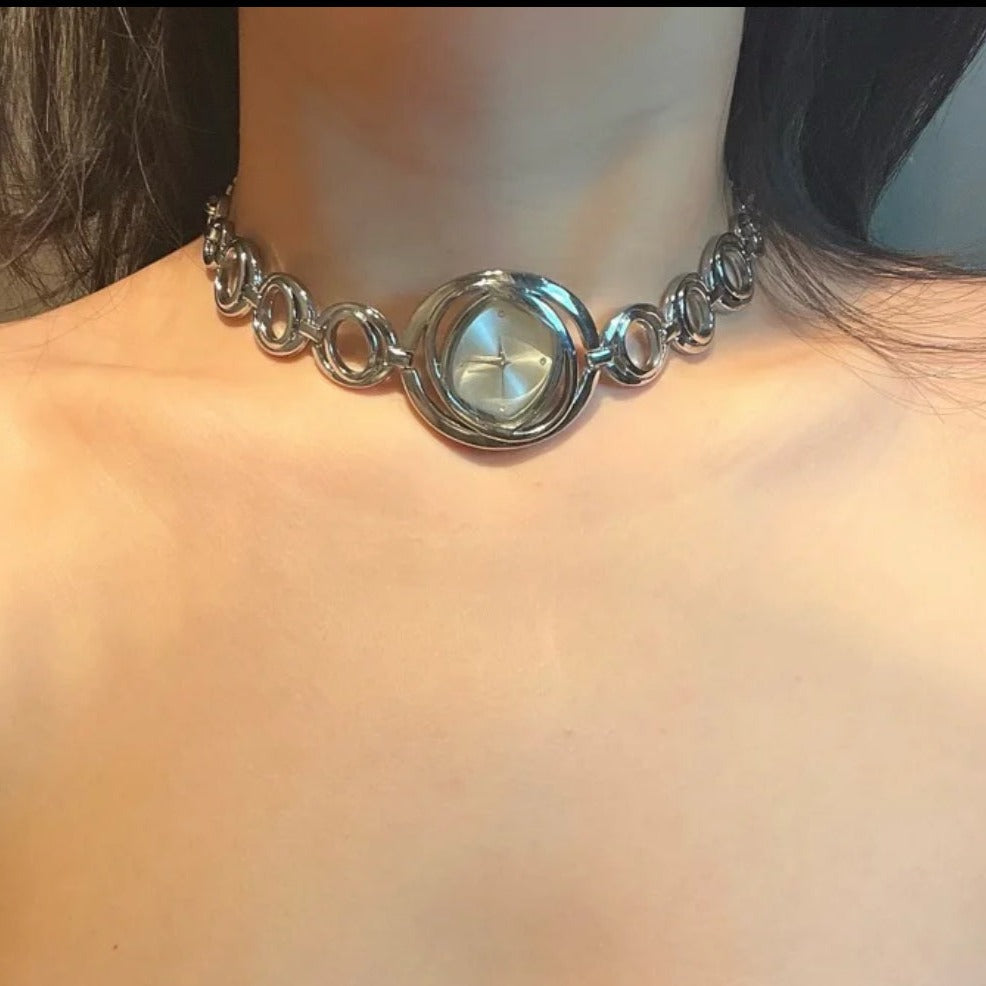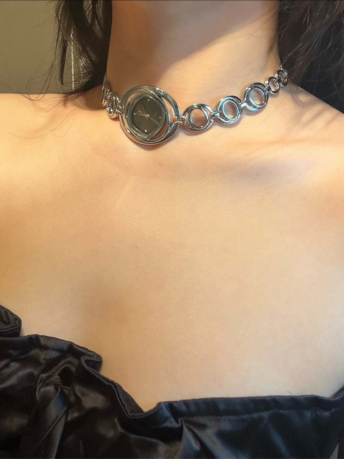 Cyberpunk Retro Watch Choker Necklace, Silver Watch Pendant Choker, Y2K Choker, stylish and cool, niche appeal, unisex.