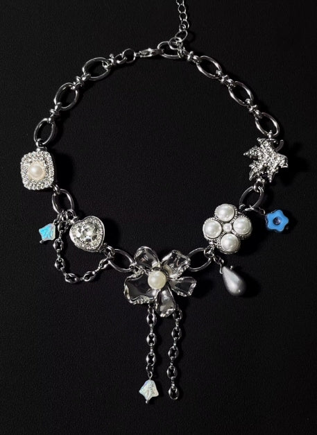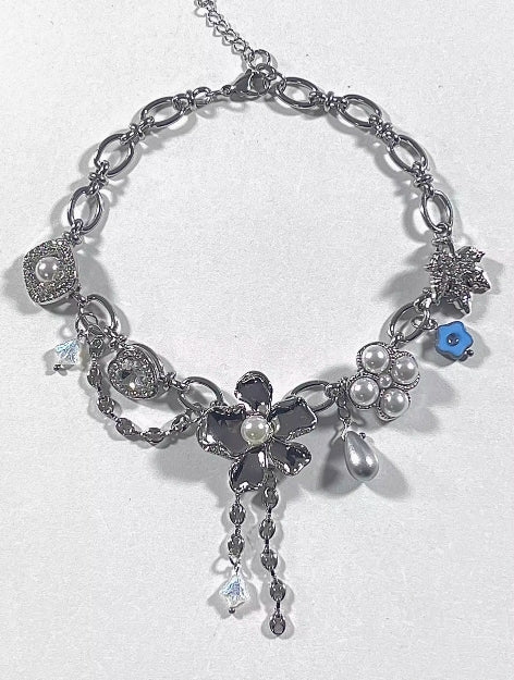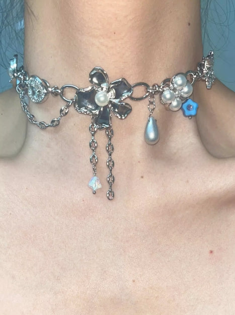 Vintage punk Flower silver choker,Pearl and gemstone embellishments,Y2K necklace ,Unique floral design, special gift