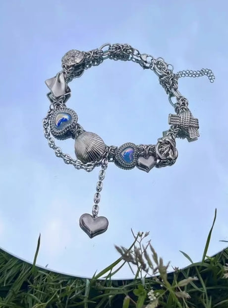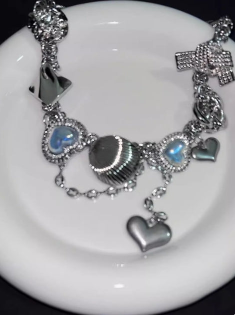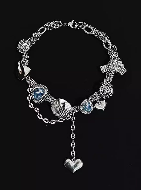 VintagePunk Seashell Blue Heart Gemstone Necklace,metallic Y2K necklace and Ocean Elements in Silver choker