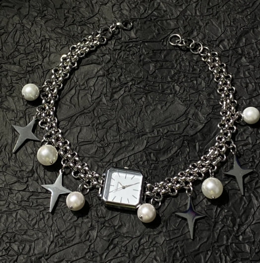 Silver watch choker with pearl and star pendant, the shape of the watch adds a touch of retro or mechanical charm.The star and pearl details add elegance and a touch of whimsy to the design.