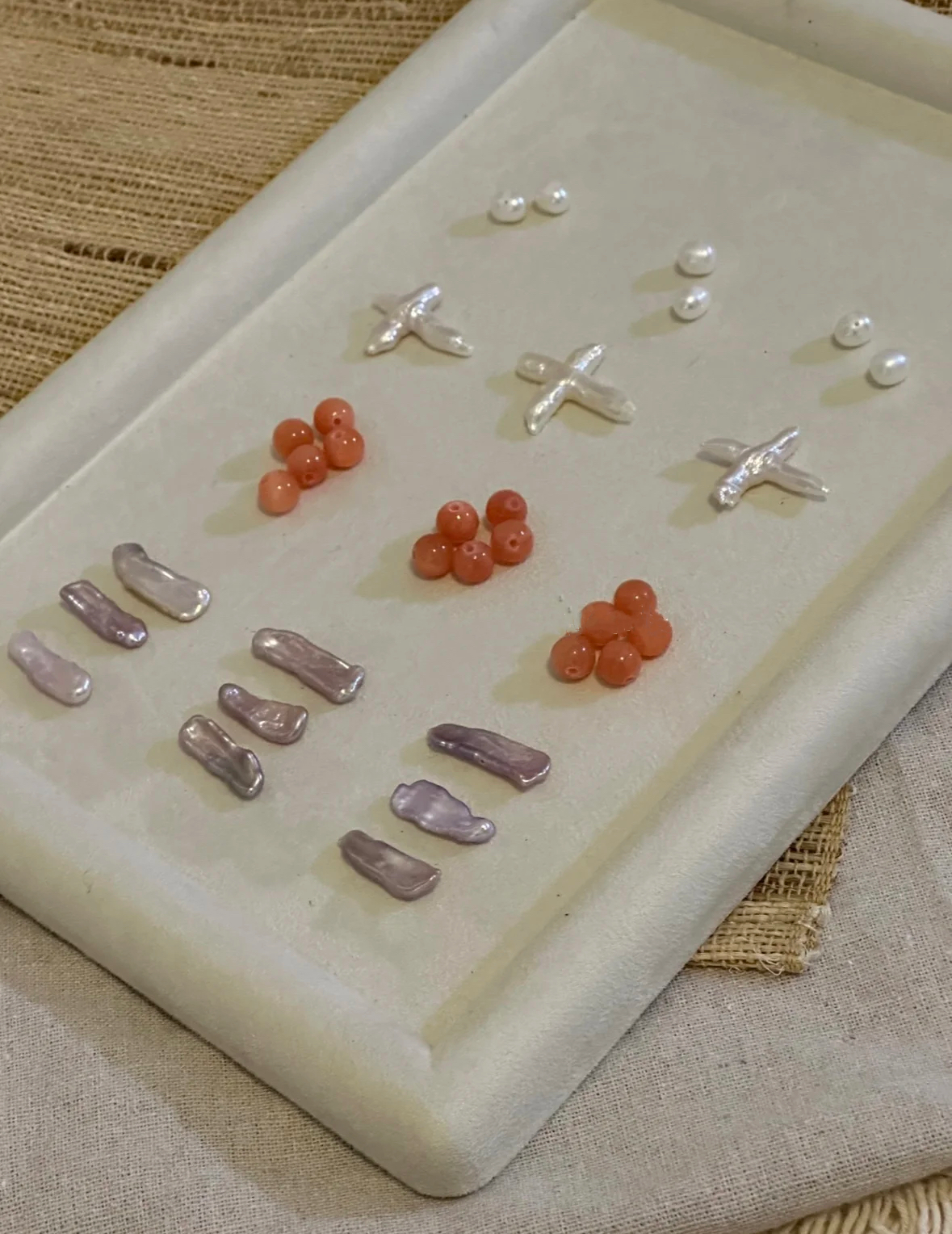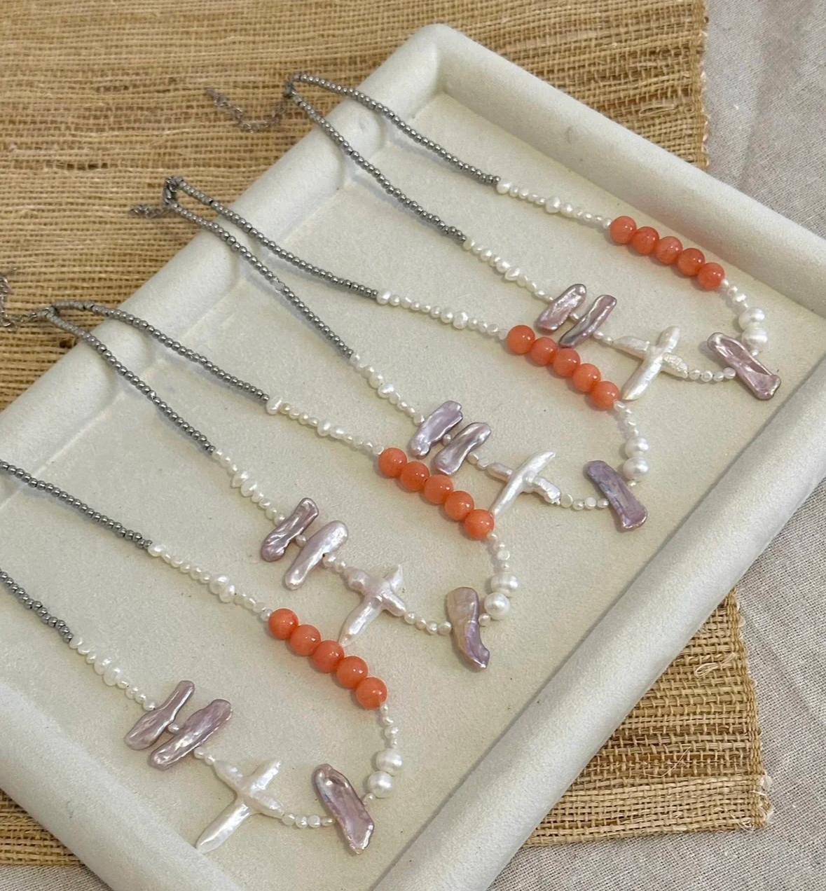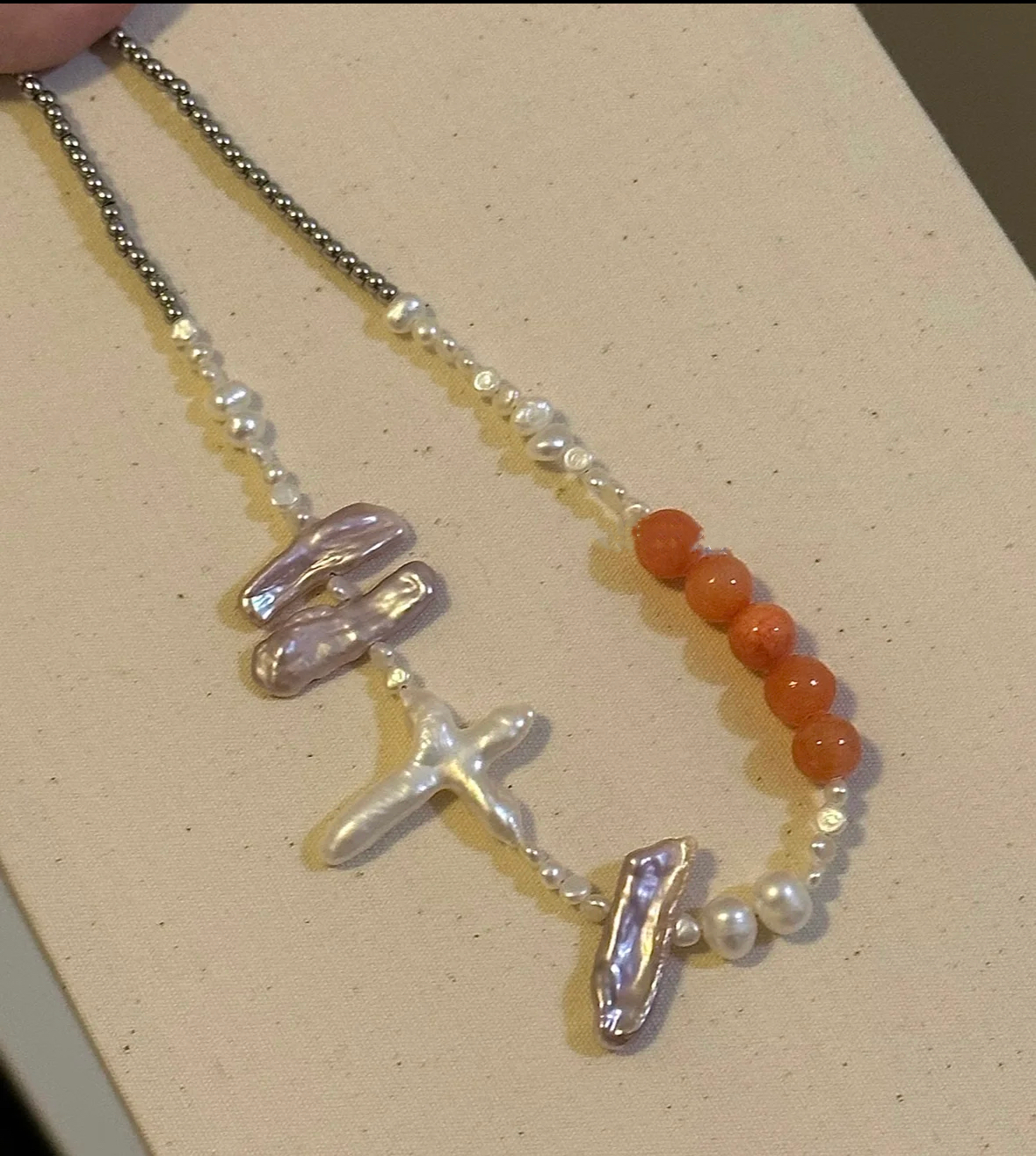 Composed of white pearl, baroque pearl, persian jade and titanium steel beads.
