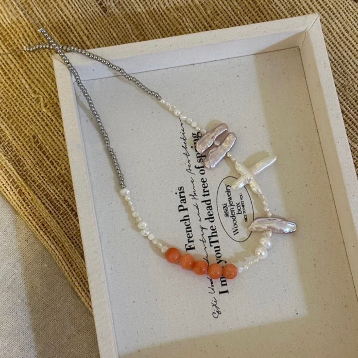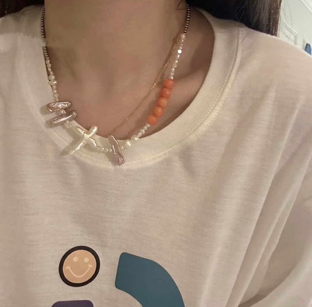 White Baroque Pearl Persian Jade Titanium Steel Beaded Handmade Necklace Charm Fashion Jewelry
