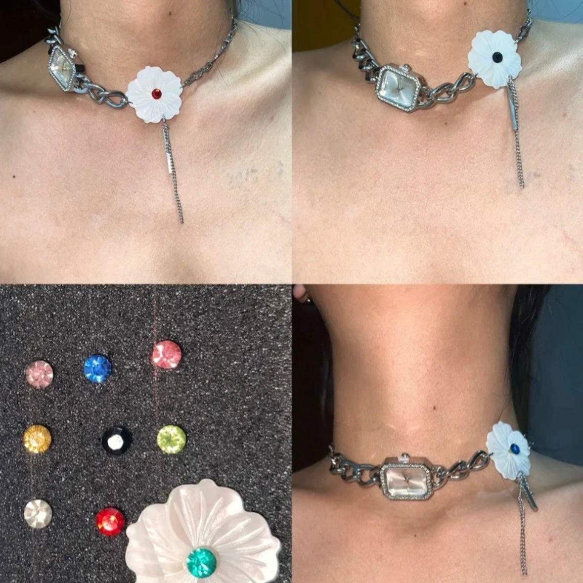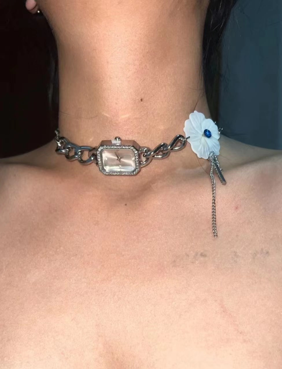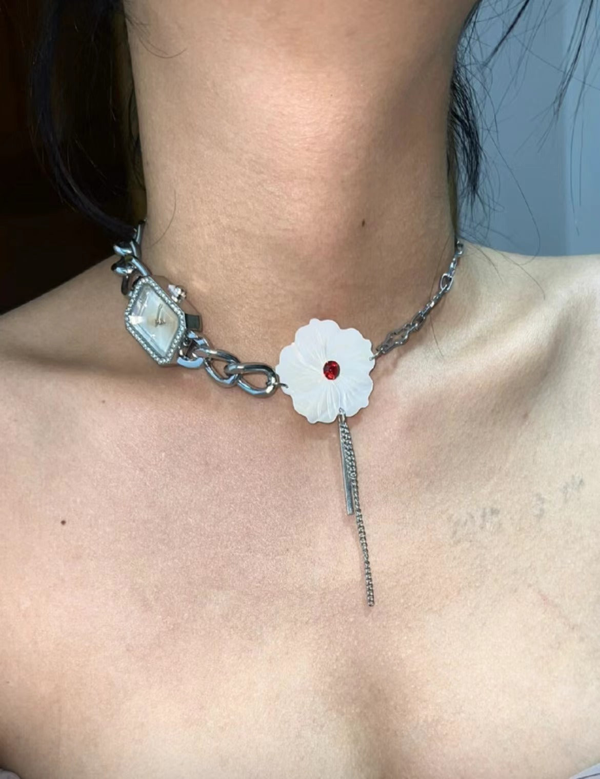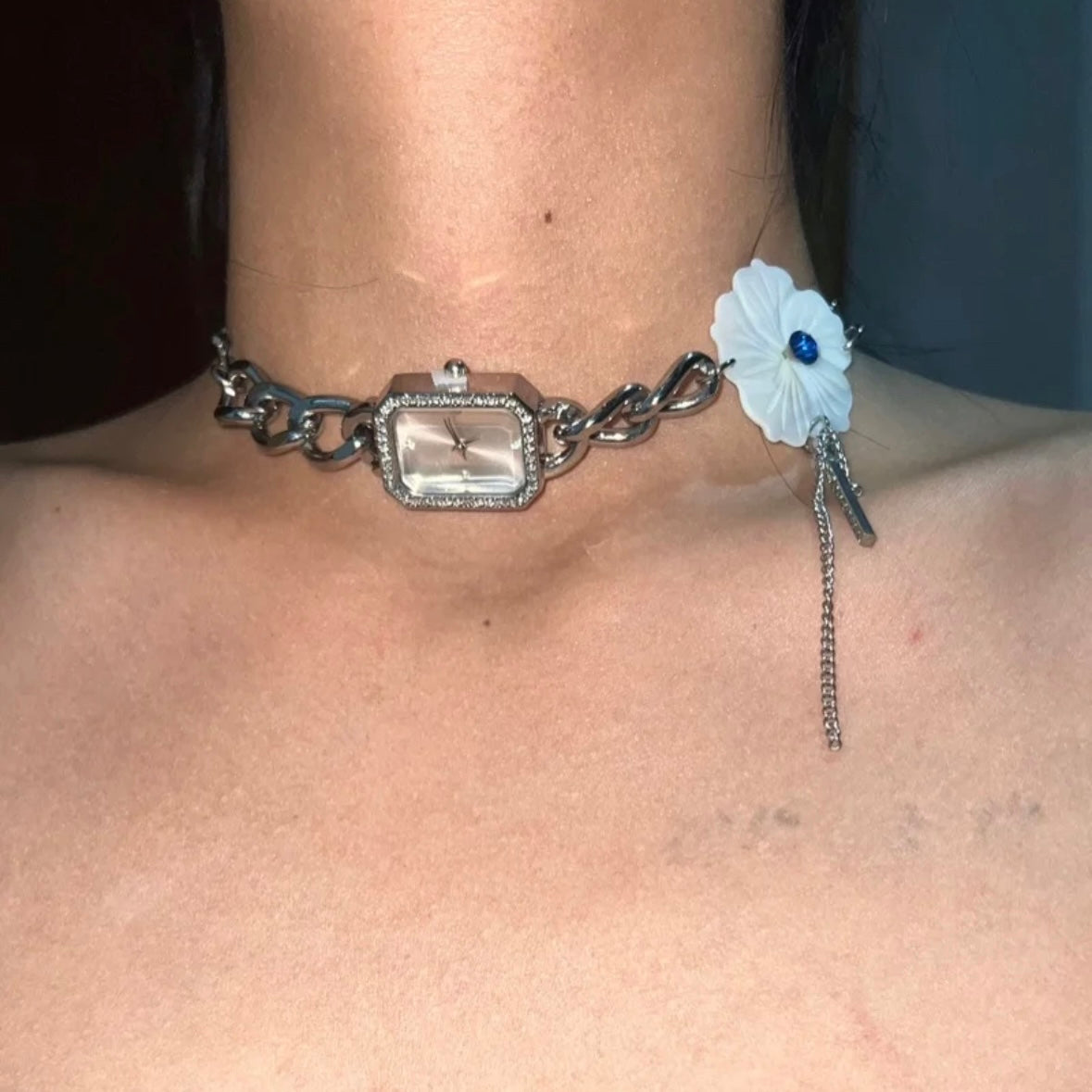 Handmade Vintage Punk White Flower Pedal Watch Choker Necklace,Y2K necklace, Niche Chunky Silver Chain Necklace, Perfect Gift for her