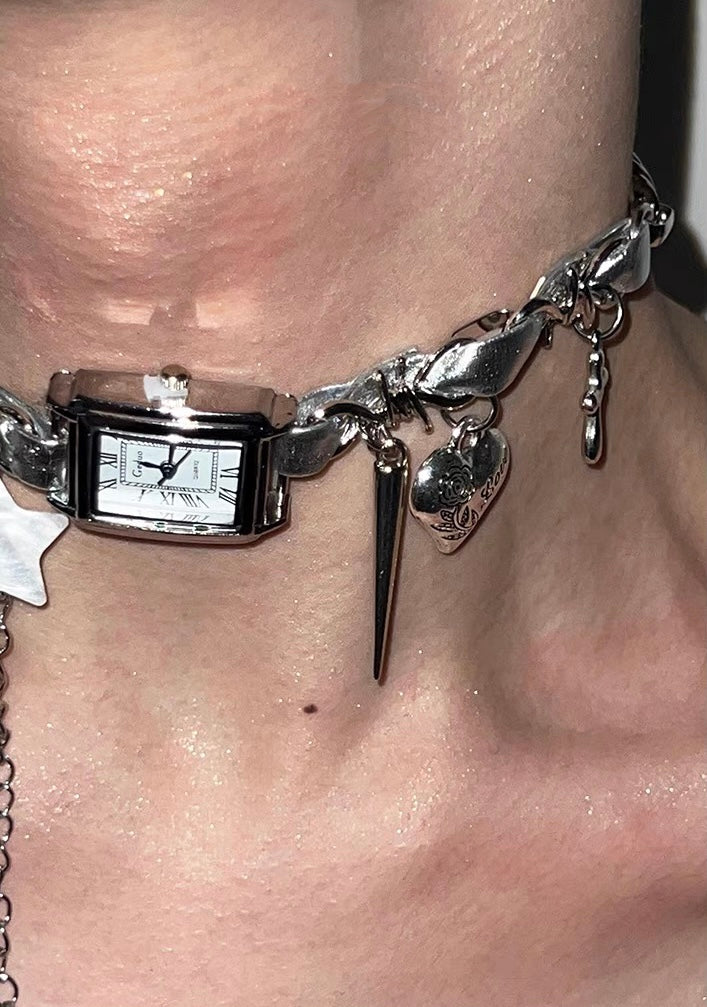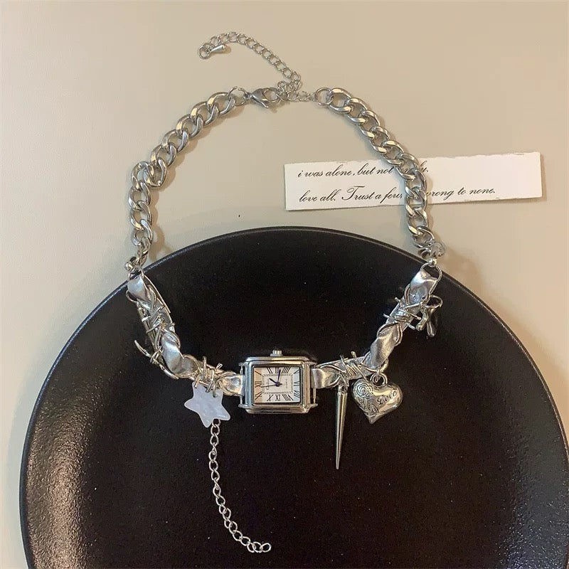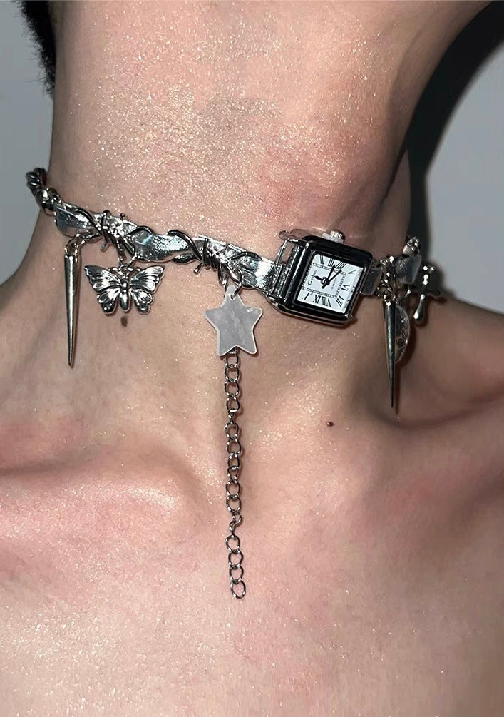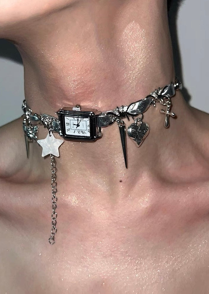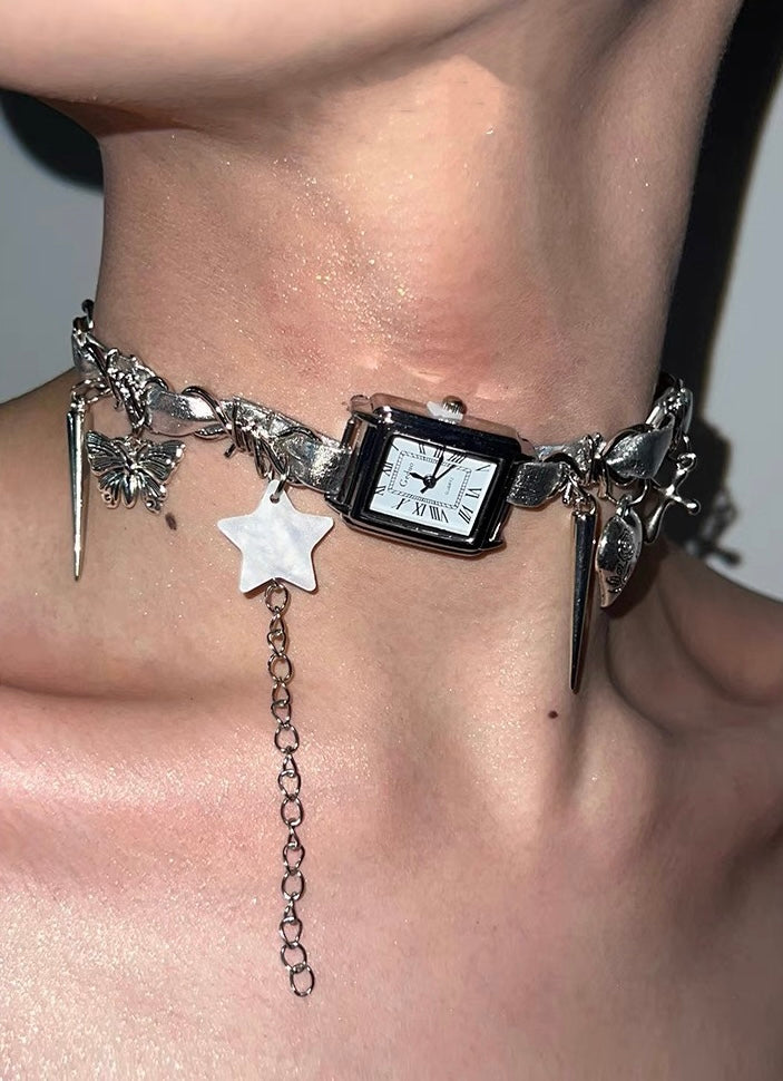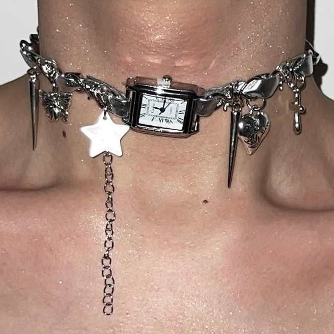 Cyberpunk Silver Watch Star Charm Leather Choker Necklace