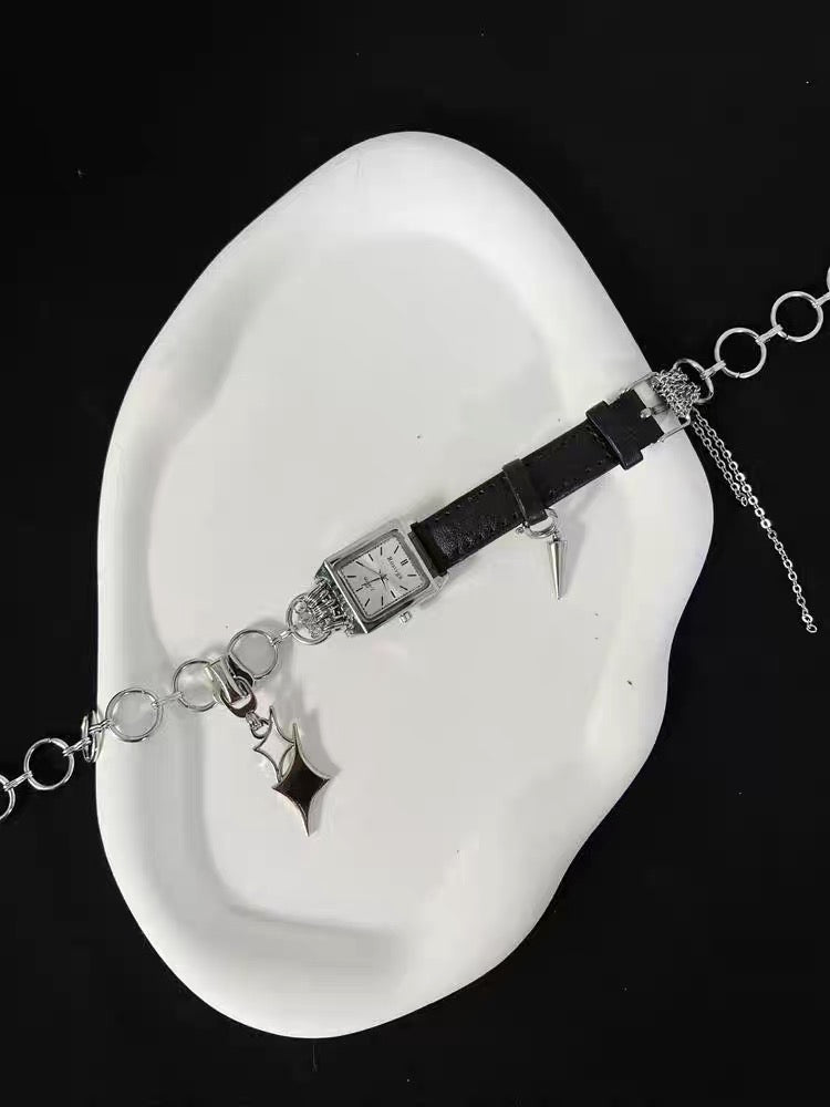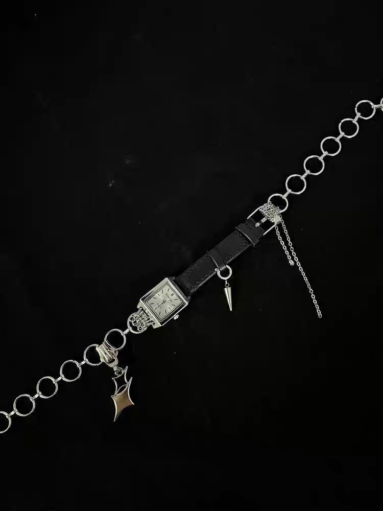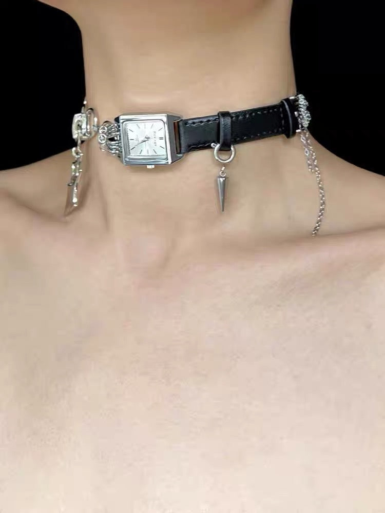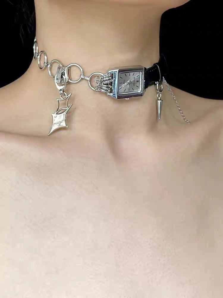 The black leather and big watch on the collar are full of classic punk style, with some chunky pendants adding an edgy flair to outfits. Adjustable chain which can fit different size.