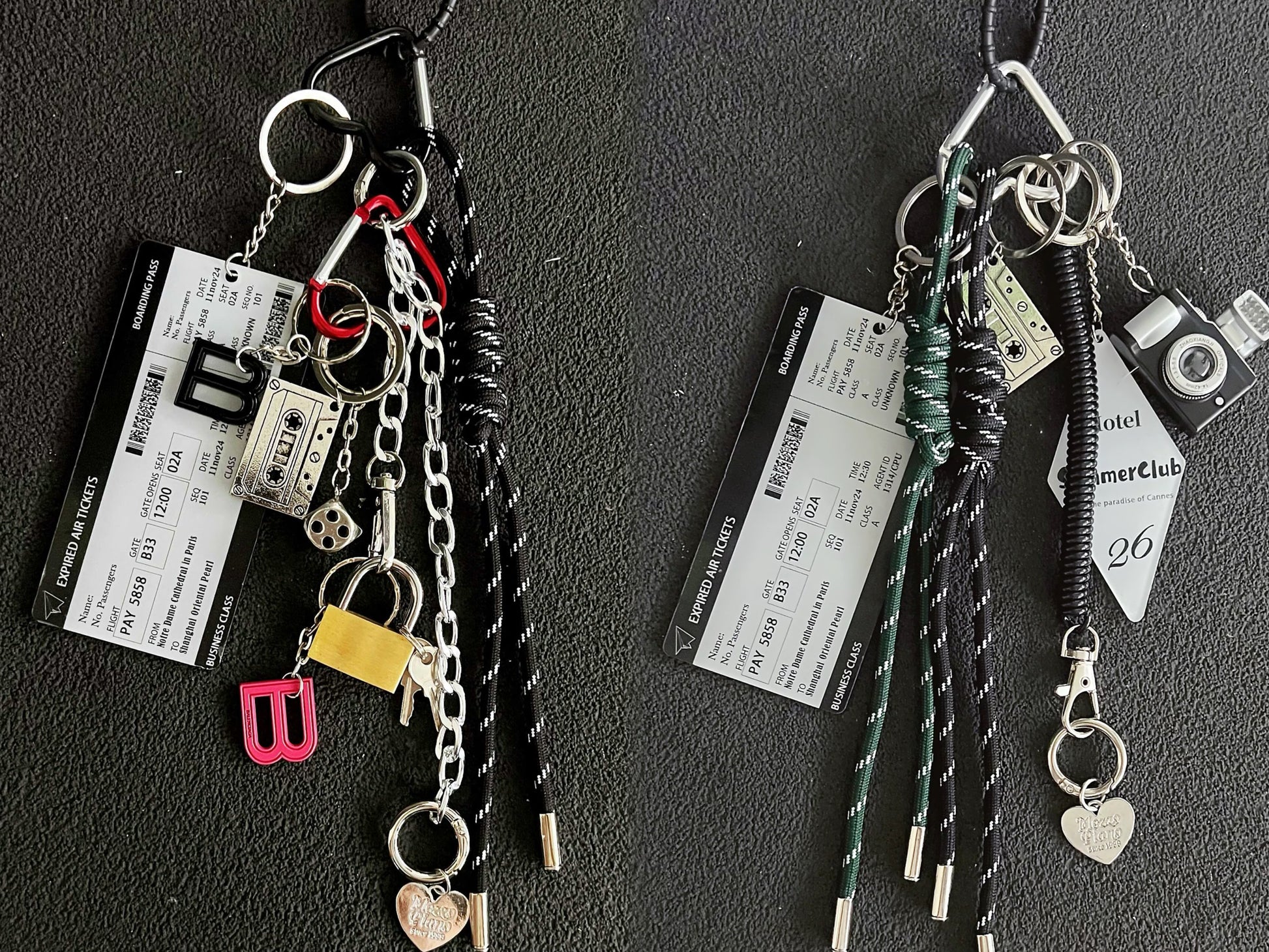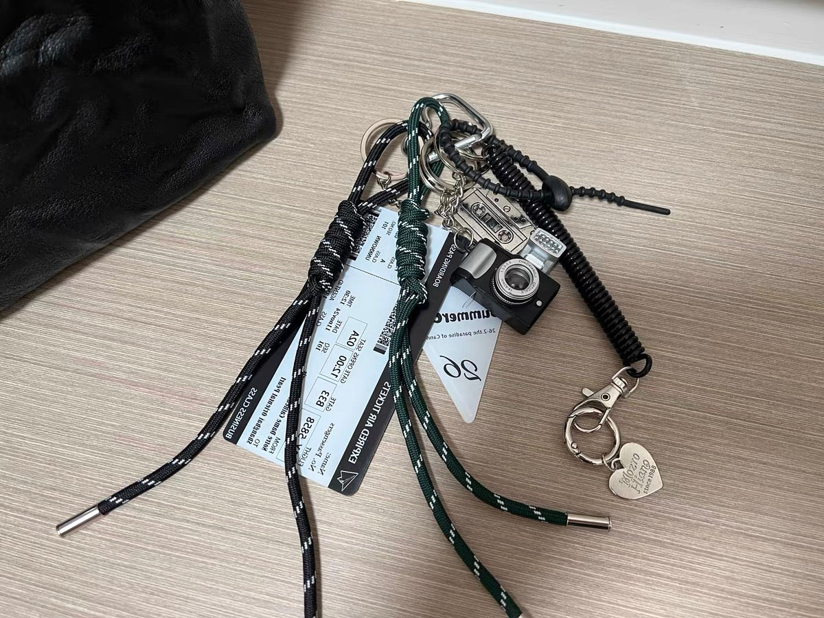 Y2K maximalist bag charm, camera, cassette woven rope keychain