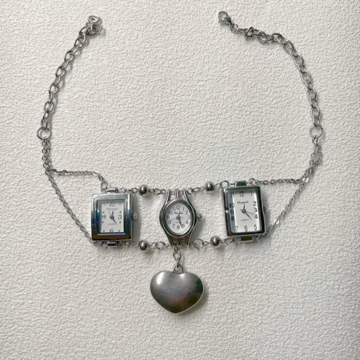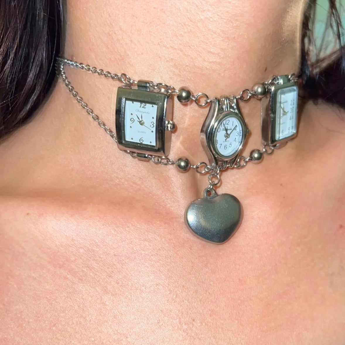 Vintage Punk Silver Chunky Watch Choker Necklace, 3 Watches Choker with Heart pendant, Y2K Necklace, Cool Trendy Choker for Man and Woman.